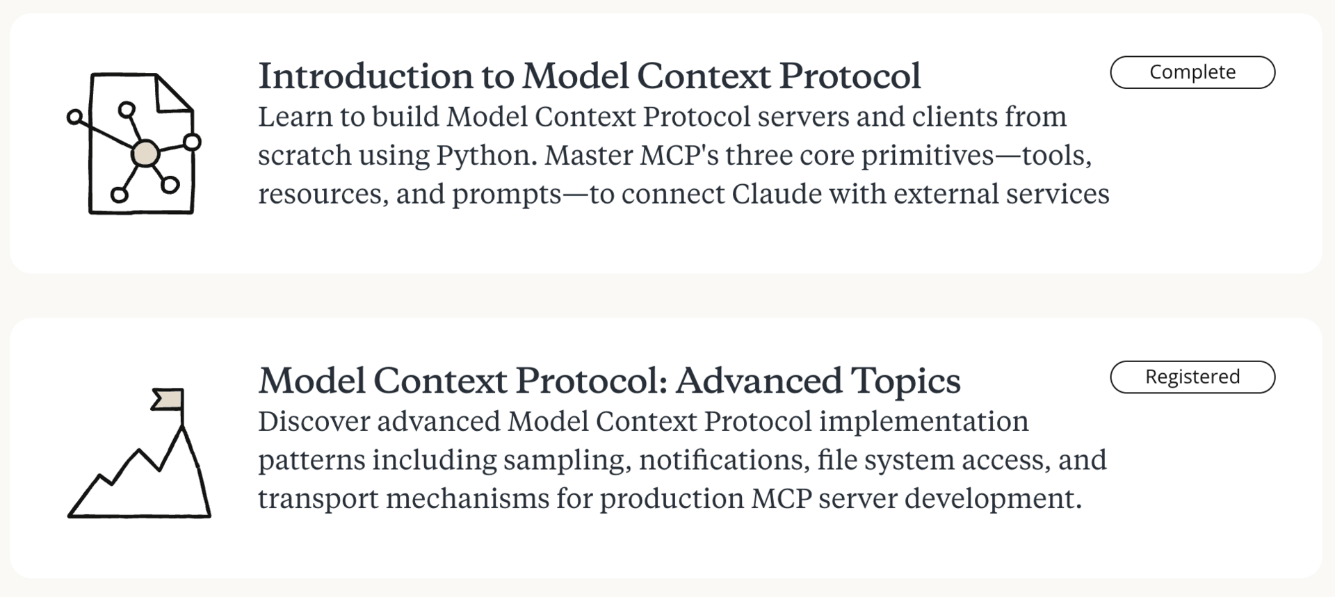 Anthropic has educational courses on Skilljar, a secure learning management system that tracks progress and provides certificates. While the courses don't require an Anthropic account, developers interested in implementing Claude AI services in their applications will need separate accounts. I took the intro to MCP course an felt it was an excellent, applied introduction to the technology.