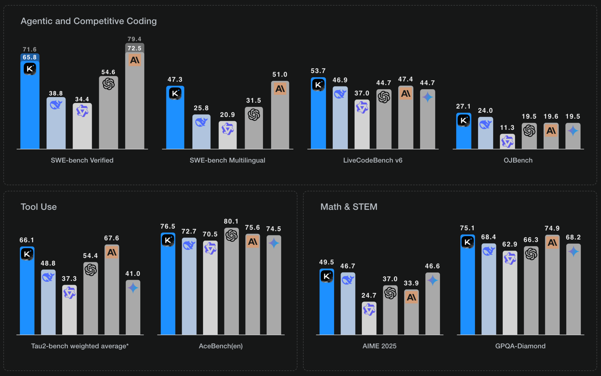 53.7% accuracy on LiveCodeBench, beating GPT-4.1's 44.7% while offering superior autonomous agent capabilities. The open-source trillion-parameter model excels at multi-step workflows, tool use, and code execution. Developers can access it via API or self-host, with competitive pricing challenging OpenAI's market position.
