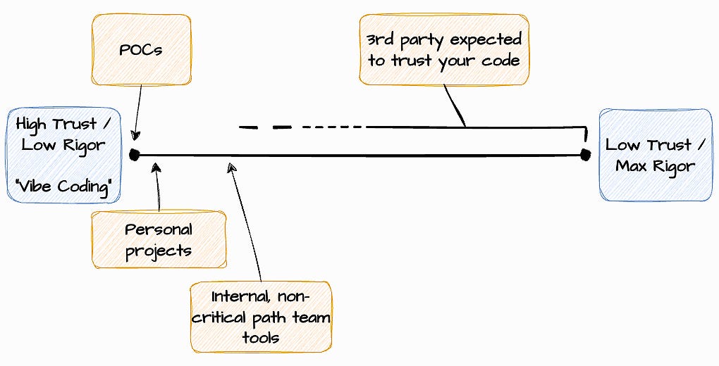 And yet AI is a tide that lifts all boats. It lowered the floor for those operating at high trust, but it also raised the ceiling for developers who understand this spectrum. The leverage available to those who can navigate between approaches and apply the right level of rigor to the right context is genuinely transformative.