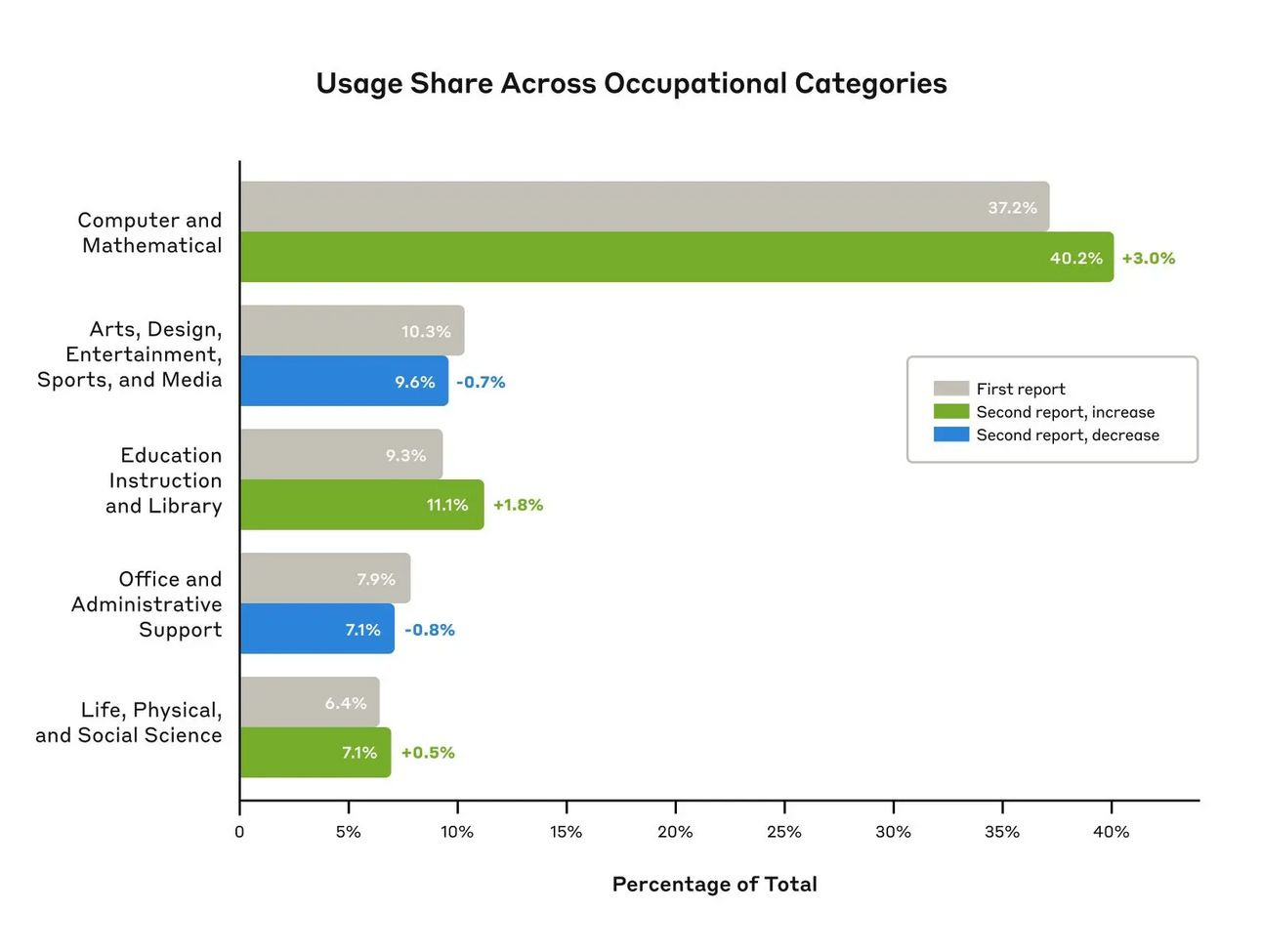 Anthropic's latest Economic Index reveals software developers are among the top users of Claude 3.7 Sonnet's new "extended thinking" mode. The report shows increased usage for coding applications, with technical professionals representing the highest percentage of this advanced capability. The analysis also examines augmentation vs. automation patterns and includes a taxonomy of 630 usage categories, with datasets freely available for developer experimentation.