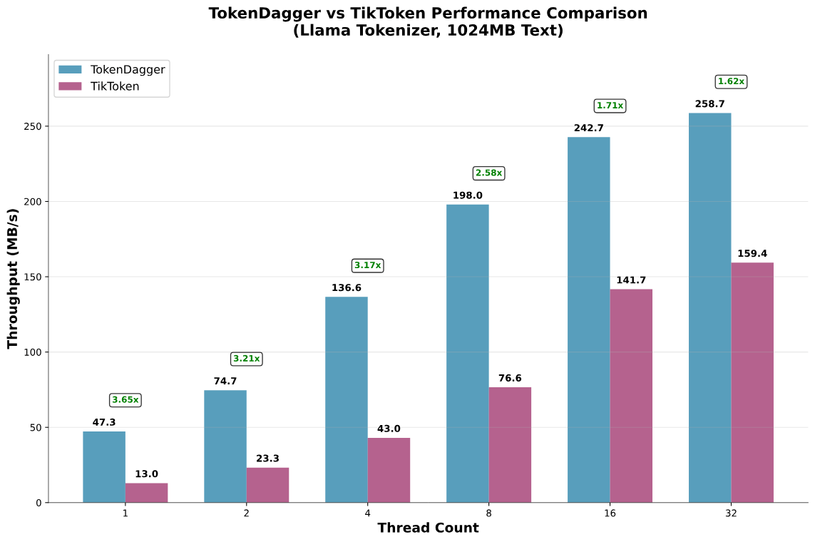 A new high-performance tokenizer implementation called TokenDagger offers 2x throughput and 4x faster code sample tokenization compared to OpenAI's TikToken. This drop-in replacement features optimized PCRE2 regex parsing and simplified BPE algorithms, making it especially valuable for developers working with large-scale LLM applications and RAG systems.