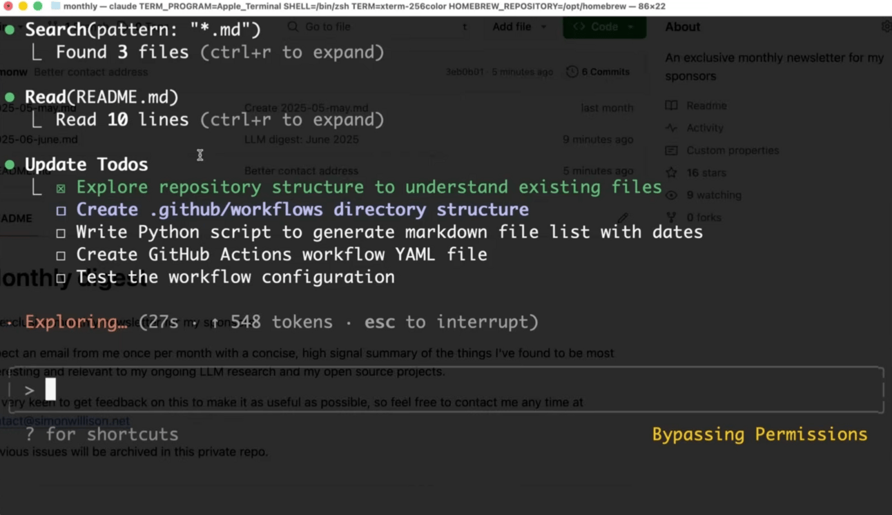 Simon Willison demonstrates how to leverage Claude Code, Anthropic's AI coding assistant, to automate GitHub repository maintenance through GitHub Actions. In a 7-minute video tutorial, he shows developers how to create a workflow that automatically updates a repository's README with an index of files, showcasing practical AI-assisted workflow automation.