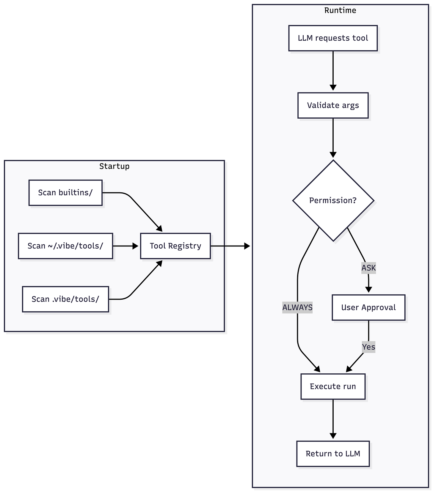 When Vibe starts, the Tool Manager scans a hierarchy of directories for Python files containing BaseTool subclasses: