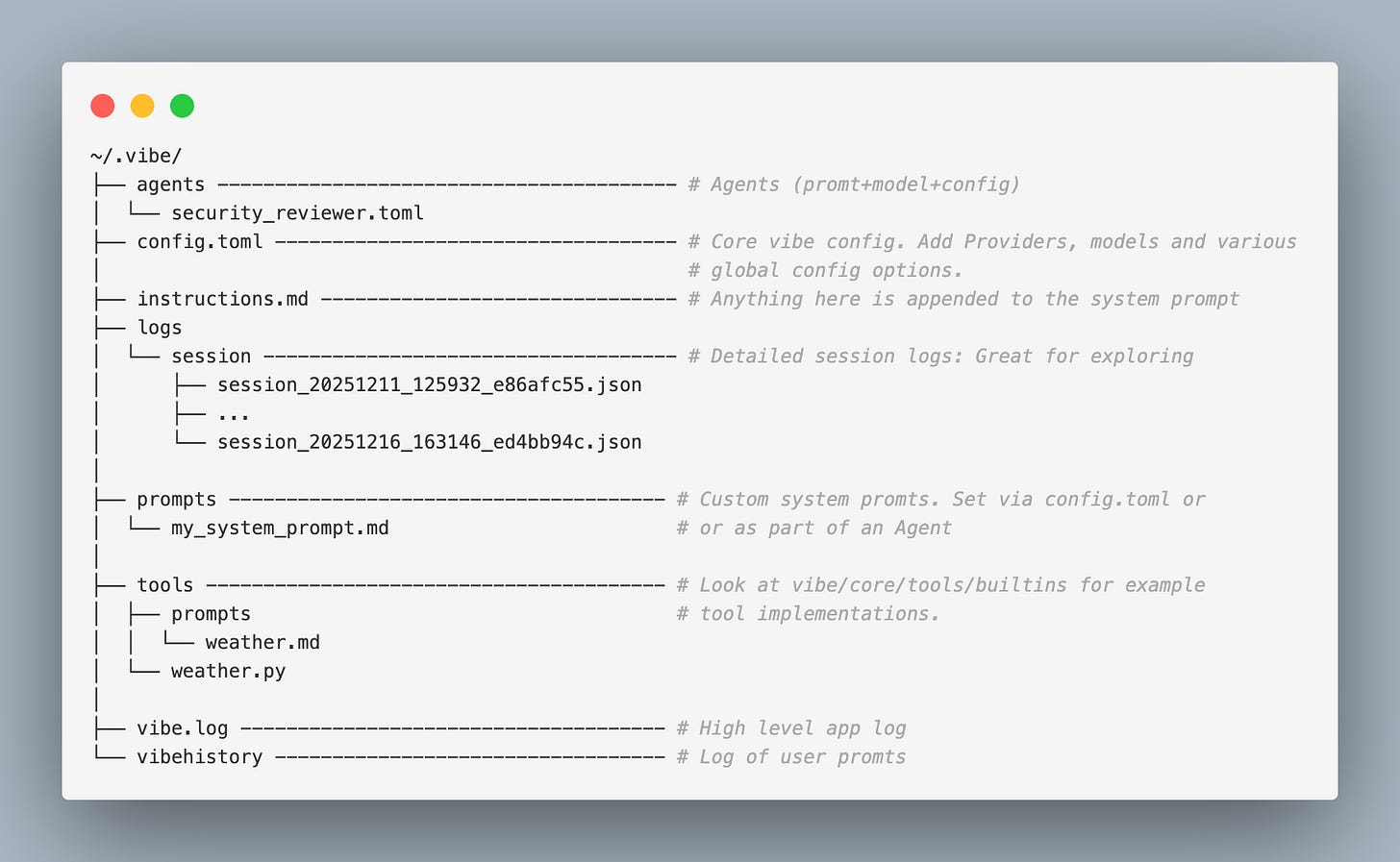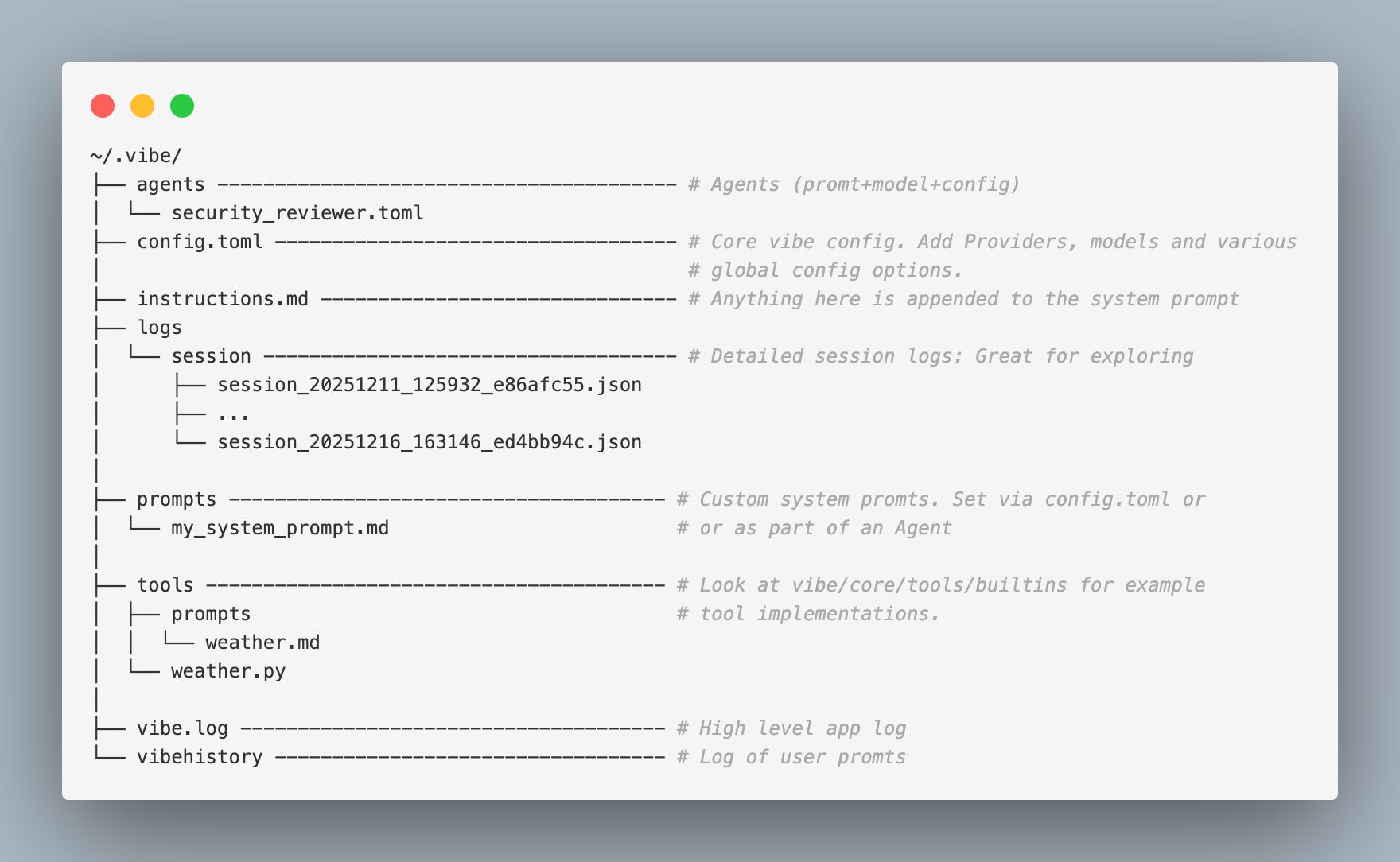 The ~/.vibe/ directory deserves special mention. The Vibe team did an excellent job extracting configuration from the codebase into this single location. Most changes or extensions you might want to undertake can be accomplished in this directory.