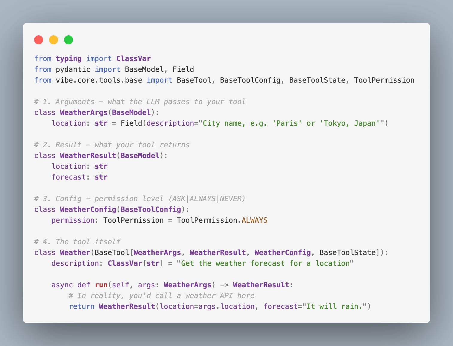Every tool consists of four Pydantic models plus the tool class. Here’s a minimal weather tool to illustrate the pattern: